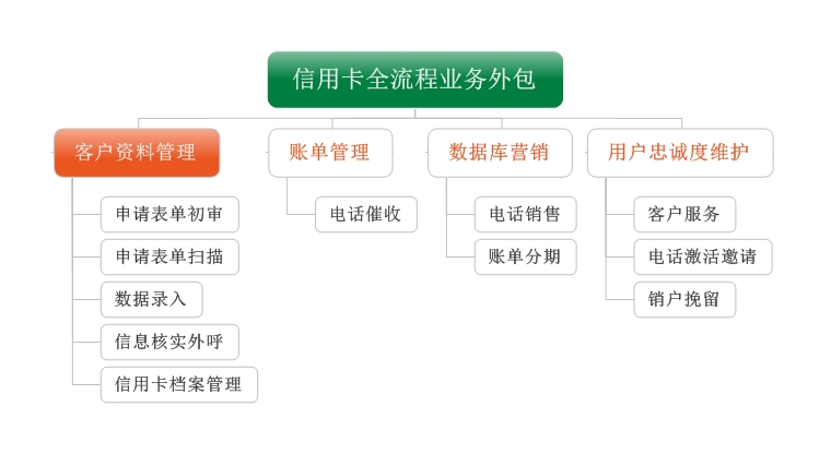 瀚海信用卡全流程業(yè)務(wù)外部服務(wù)涵蓋銀行信用卡用戶資料管理、銀行信用卡用戶忠誠度維護、客戶賬單信息管理及數(shù)據(jù)庫營銷等服務(wù),其中銀行信用卡用戶資料管理主要為以下五大類: